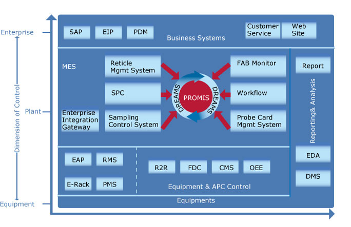 公司CIM系統(tǒng)以MES系統(tǒng)為中心,配以設(shè)備的自動(dòng)運(yùn)行系統(tǒng)(EAP),菜單管理系統(tǒng)(RMS),設(shè)備預(yù)防性維護(hù)系統(tǒng)(PMS),與先進(jìn)的制程控制(APC)等相互配合,以維持良率與產(chǎn)能,再輔以質(zhì)量監(jiān)控系統(tǒng)、實(shí)時(shí)報(bào)告系統(tǒng)、以及靈活的系統(tǒng)整合接口,構(gòu)成了一個(gè)完整的計(jì)算機(jī)集成制造系統(tǒng)。這一系統(tǒng)進(jìn)一步實(shí)現(xiàn)了生產(chǎn)過(guò)程的自動(dòng)化,使工藝更加穩(wěn)定,質(zhì)量及工藝可靠性獲得提高,產(chǎn)品的生產(chǎn)周期進(jìn)一步縮短。