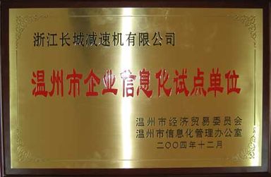 04年11月10日,溫州市經貿局經濟貿易委員會領導來我們公司視察。對我們公司的信息化建設情況作了一個考評,在聽取公司IT部經理陳德建對公司信息化建設作了詳細的介紹后,經貿局領導又進行了嚴格的視察,最后對我們公司信息化建設予以肯定,并對我們公司信息化建設的不足處提出了希望。于11月27日正式確定,我們公司為“溫州市企業信息化試點單位”。并于05年4月15日正式發放了牌匾。