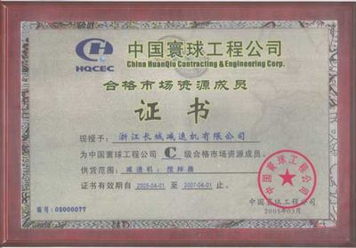 2005年6月3日,虞總應邀出席“第一屆中國寰球工程公司合格市場資源成員證書頒發儀式暨工程項目總承包研討會”,代表公司領取了中國寰球工程公司頒發的“合格市場資源成員證書”。長城減速機以其可靠的產品質量、良好的信譽及完善的售后服務在近二百家企業競爭中脫穎而出,成為中國寰球工程公司“動設備/成套設備組”的合格分供方。